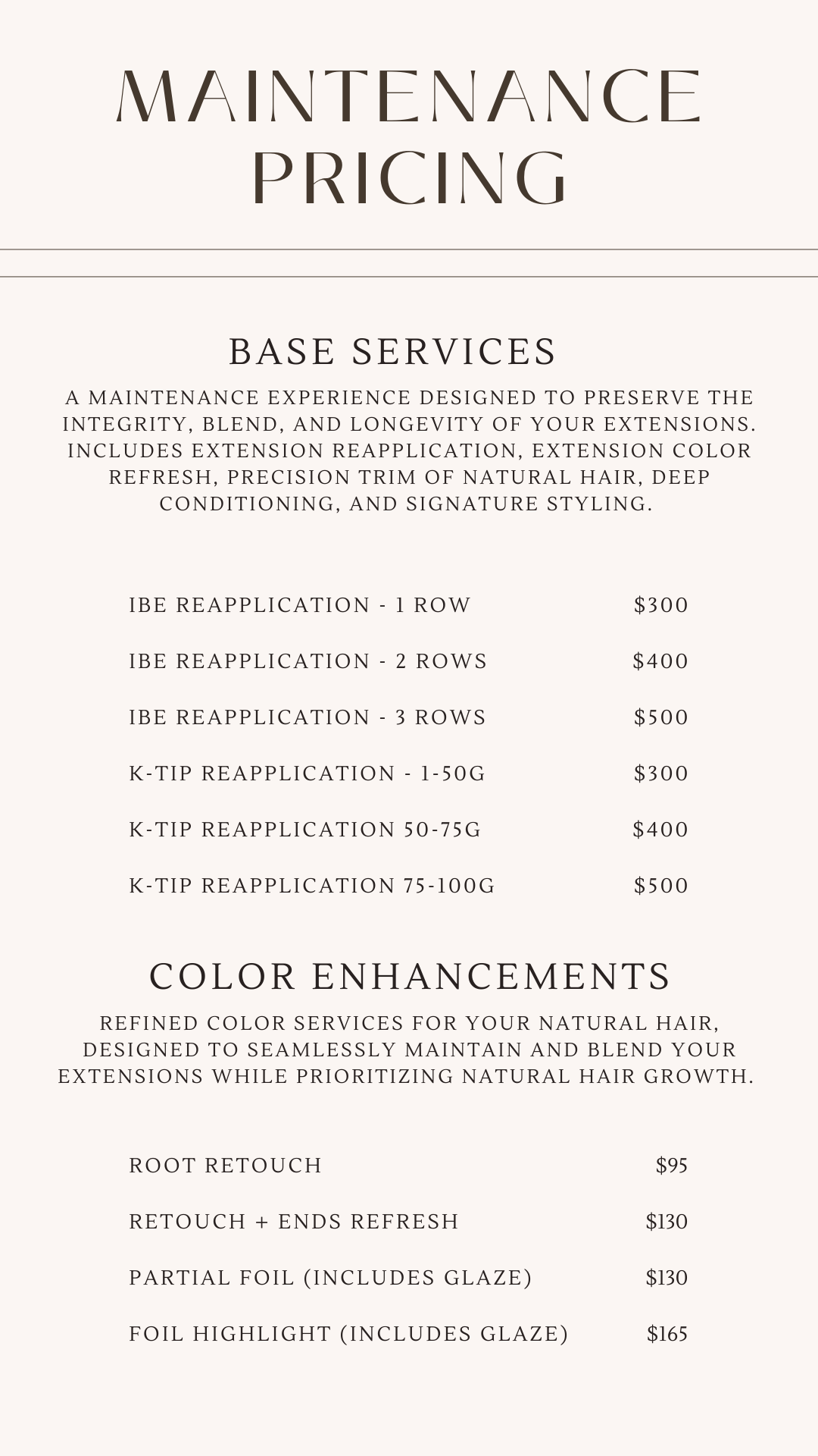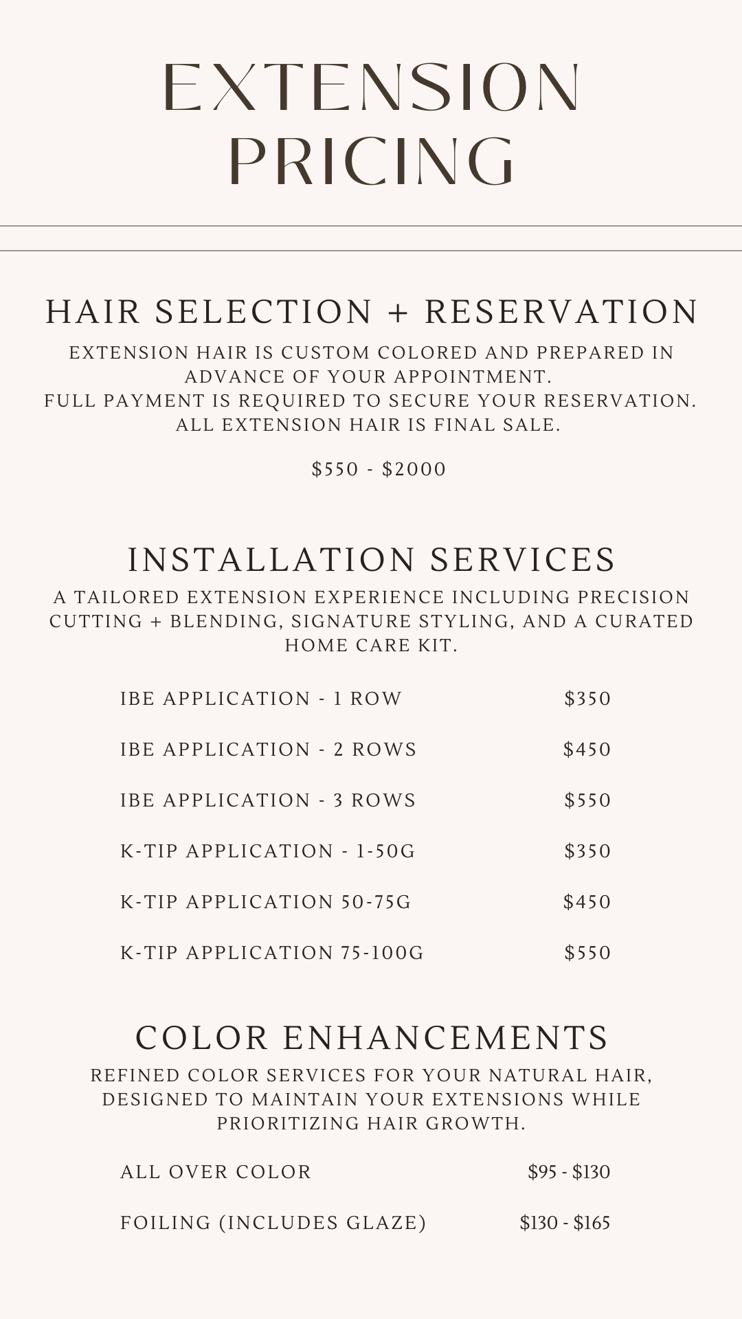 These temporary extension pieces offer the look of extensions without the commitment and are perfect for those wanting to add length or fullness for their wedding day, date nights, special occasions, or just on days they feel like it! Each halo or set of clip-ins comes with a consultation, custom color, fitting, cut for blending, and styling lesson.